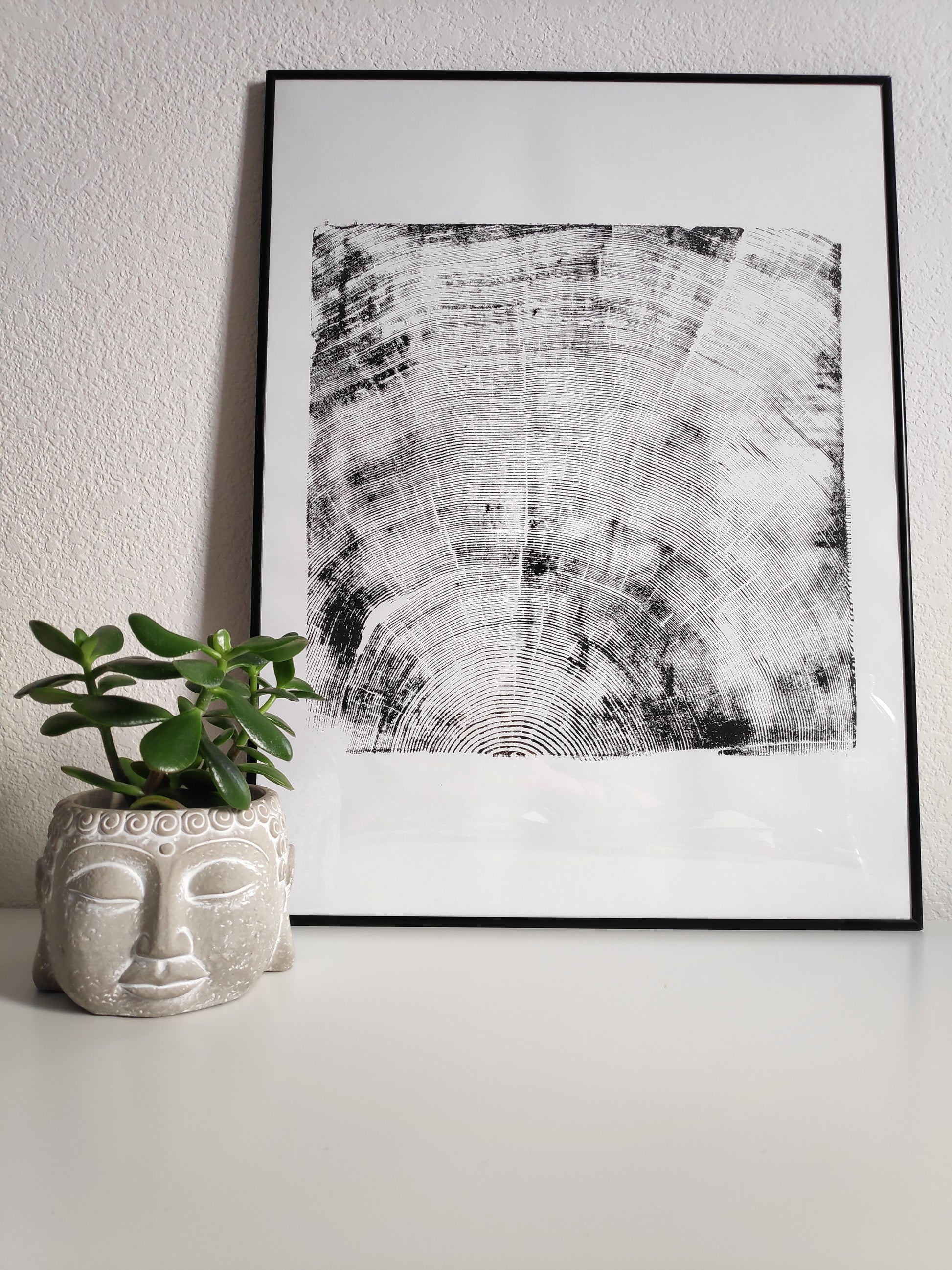 Unique relief print from the cross section of a tree with a wooden frame.